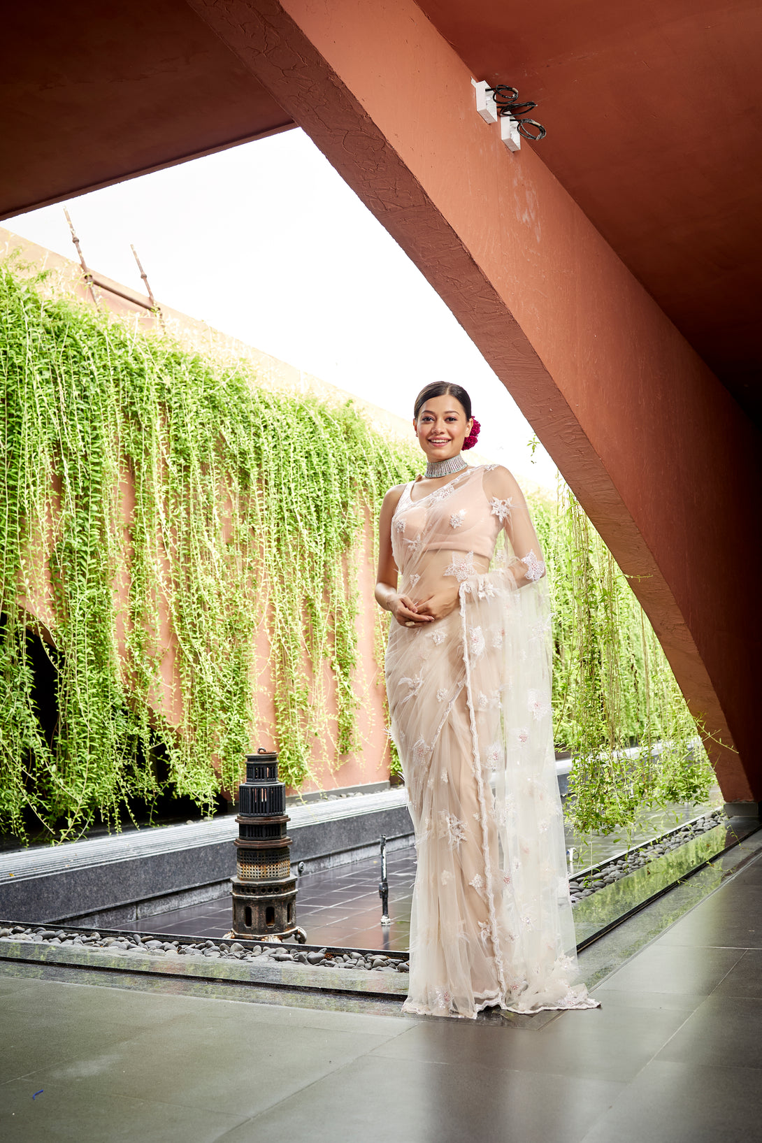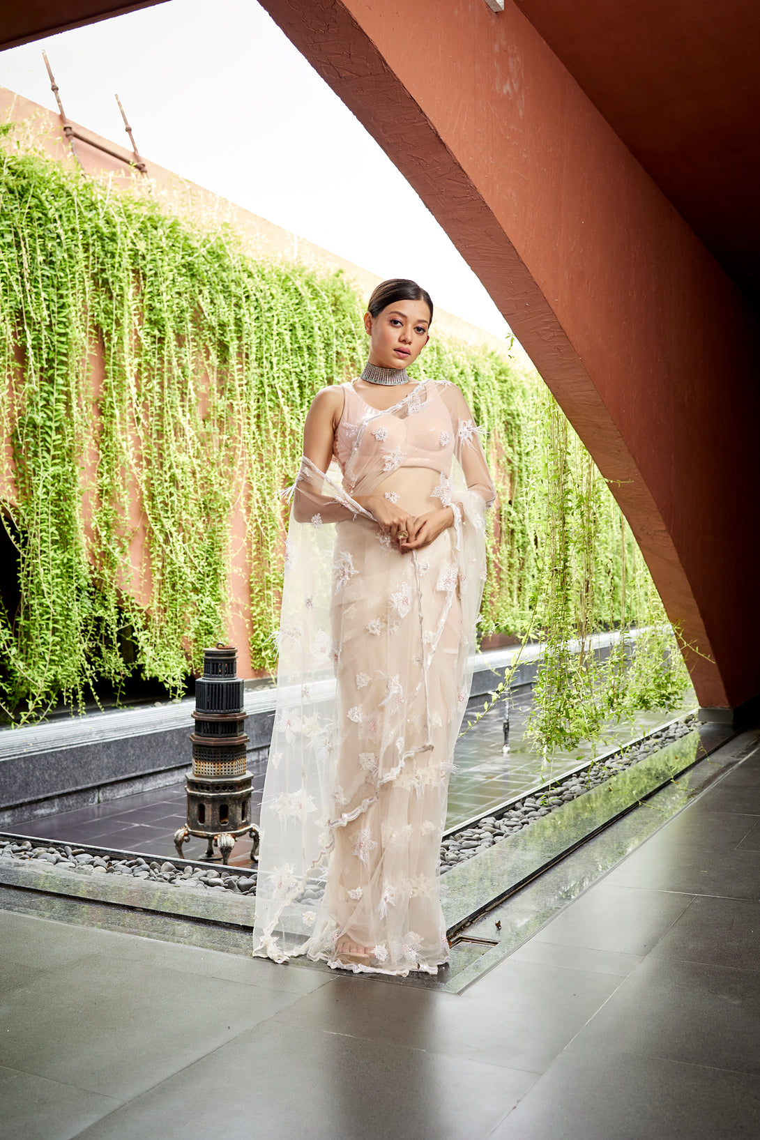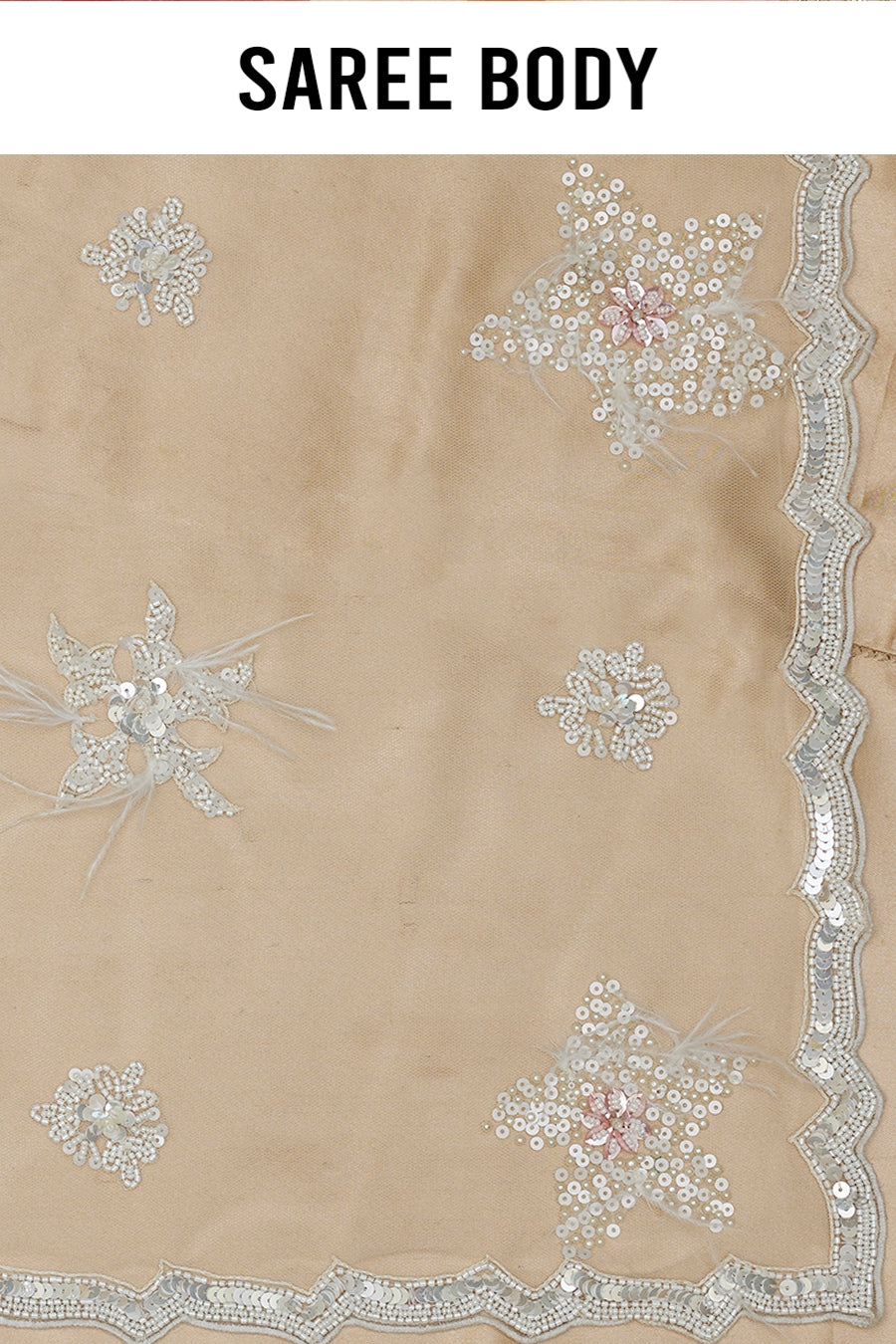 Off white butterfly net saree embroidered with pearls, sequins, beads and feather work all over .